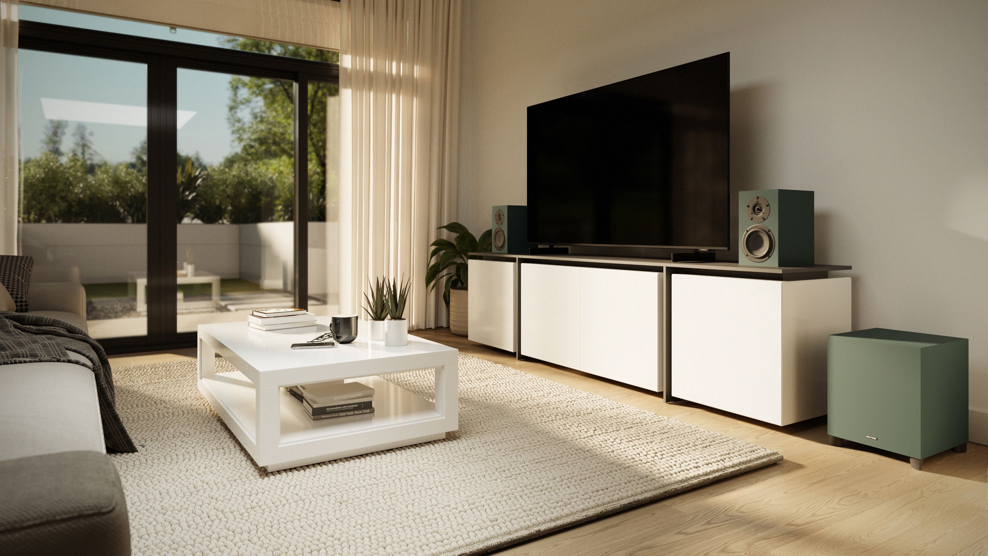 Der Lautsprecher ist in fünf eleganten Farben erhältlich: Studio Black, Studio White, Studio Navy, Studio Charcoal und Studio Green. Dezente magnetische Abdeckungen sorgen für einen minimalistischen Look, der sich harmonisch in jedes Interieur einfügt. Die hochwertige Verarbeitung unterstreicht die australische Handwerkskunst von Krix.