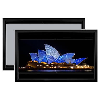 Die manuelle WS Spalluto MultiformatFrame im Grundformat 16:9 mit vertikaler Maskierung (oben/unten) hat für jedes Breitbildformat den richtigen Rahmen. Einfache Änderung des Bildformates von 16:9 auf 21:9 (2,35:1) mit nur einem Handgriff. Die obere und untere Maskierung werden parallel gegeneinander bewegt. Ein Spannmechanismus sorgt dabei für optimale Straffung der Maskierung. Das Leinwandtuch hat eine graue Rückseite. Der mit schwarzem Samt bezogene Alu-Rahmen ist 10,5 cm breit, die Profilstärke beträgt 6,0 cm.